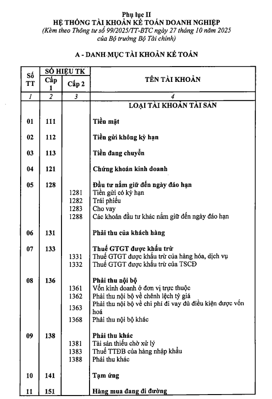 - Điều 11 Thông tư 99/2025/TT-BTC quy định áp dụng hệ thống tài khoản kế toán mới tại Phụ lục II kèm theo Thông tư số 99.