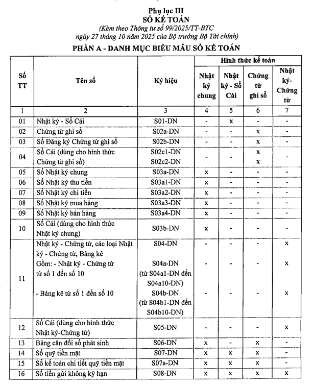 - Phụ lục 3: Danh mục biểu mẫu Sổ kế toán, gồm 42 mẫu sổ. Trước đây theo Thông tư 200 có 45 sổ.