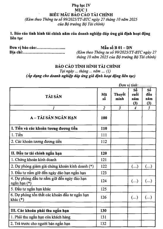 | Biểu mẫu Báo cáo tài chính năm, Báo cáo tài chính giữa niên độ (dạng đầy đủ và dạng tóm lược) | Được hướng dẫn tại Phụ lục IV ban hành kèm theo Thông tư 99/2025/TT-BTC. Những chỉ tiêu không có số liệu được miễn trình bày trên Báo cáo tài chính, doanh nghiệp chủ động đánh lại số thứ tự theo nguyên tắc liên tục trong mỗi phần nhưng không được đánh lại “Mã số” chỉ tiêu. |